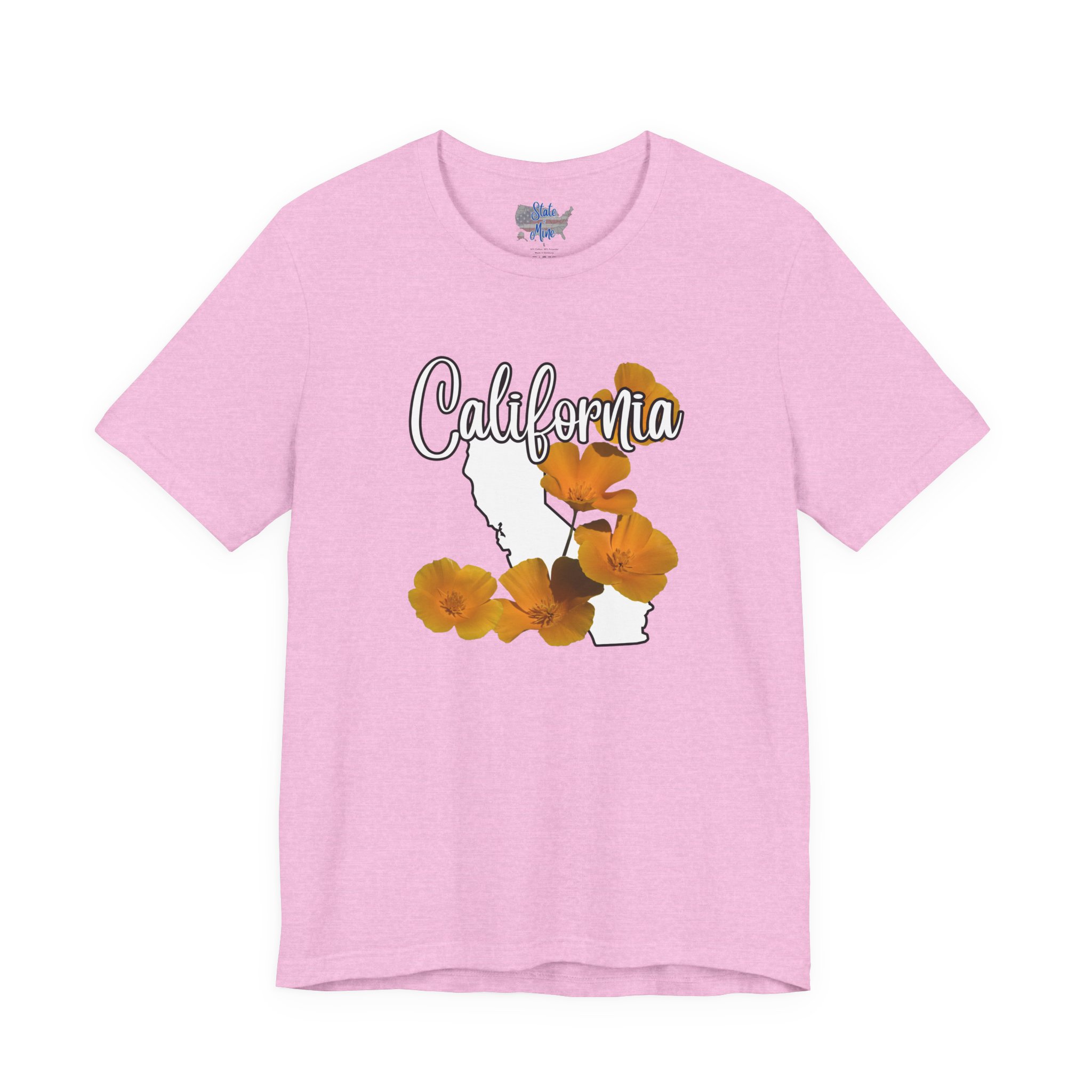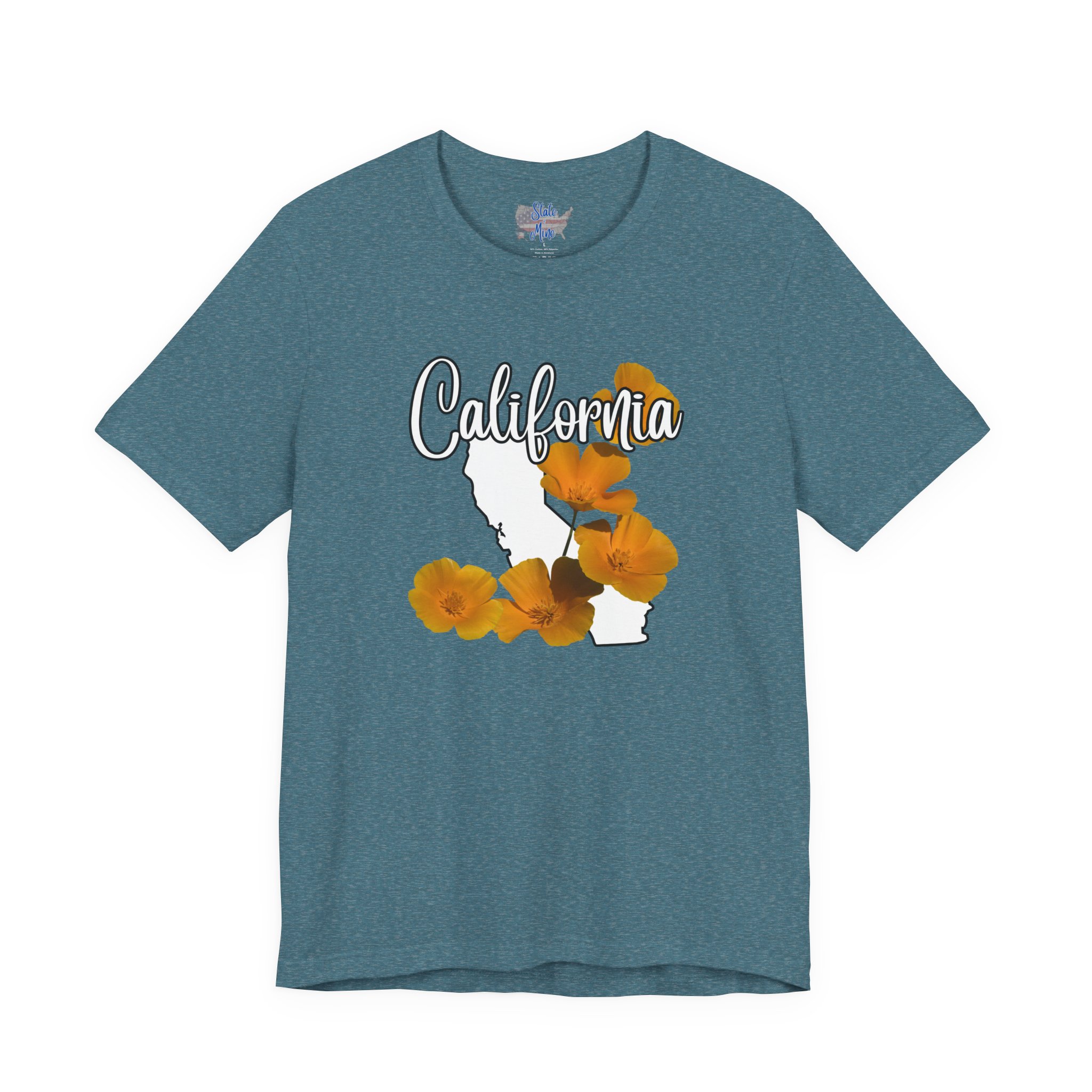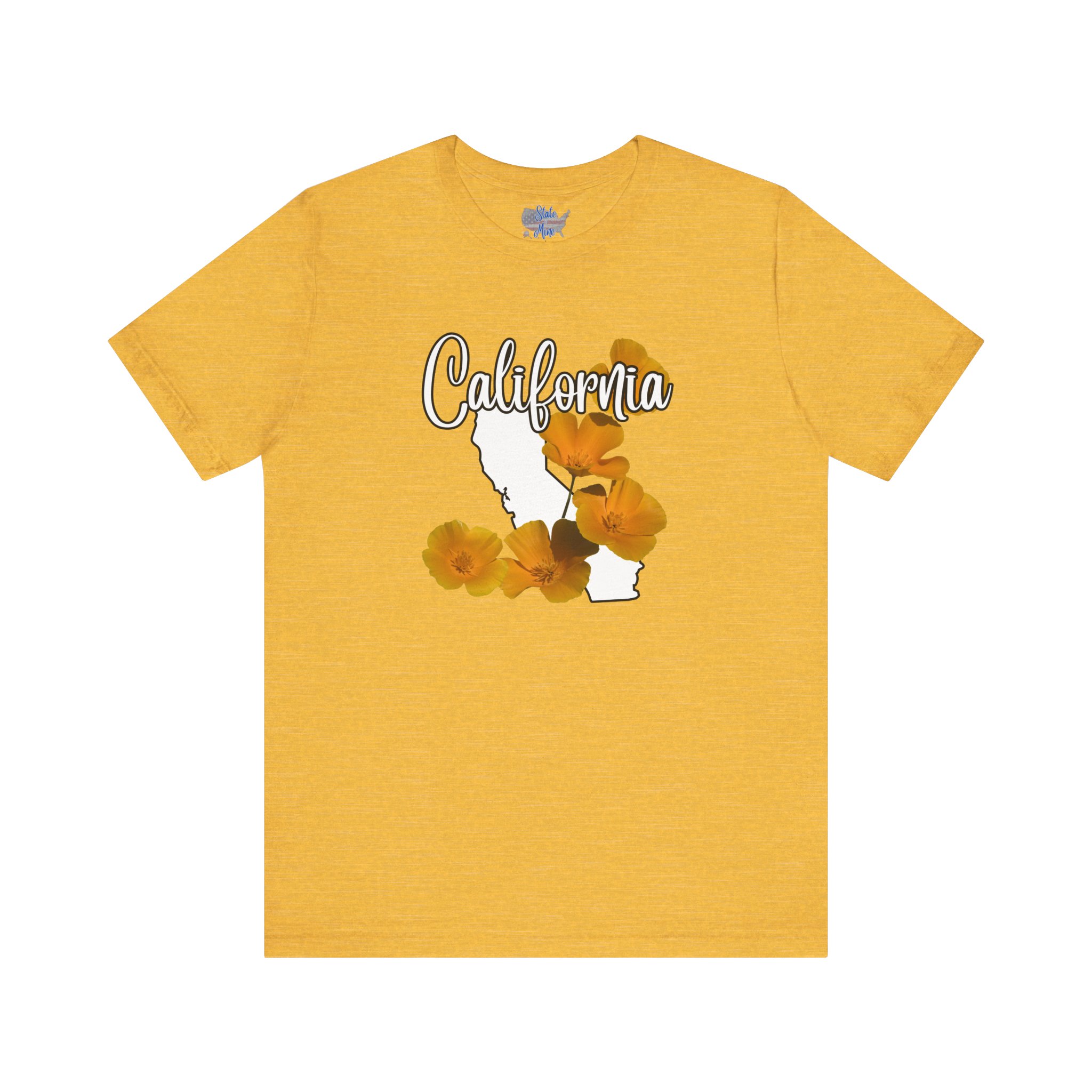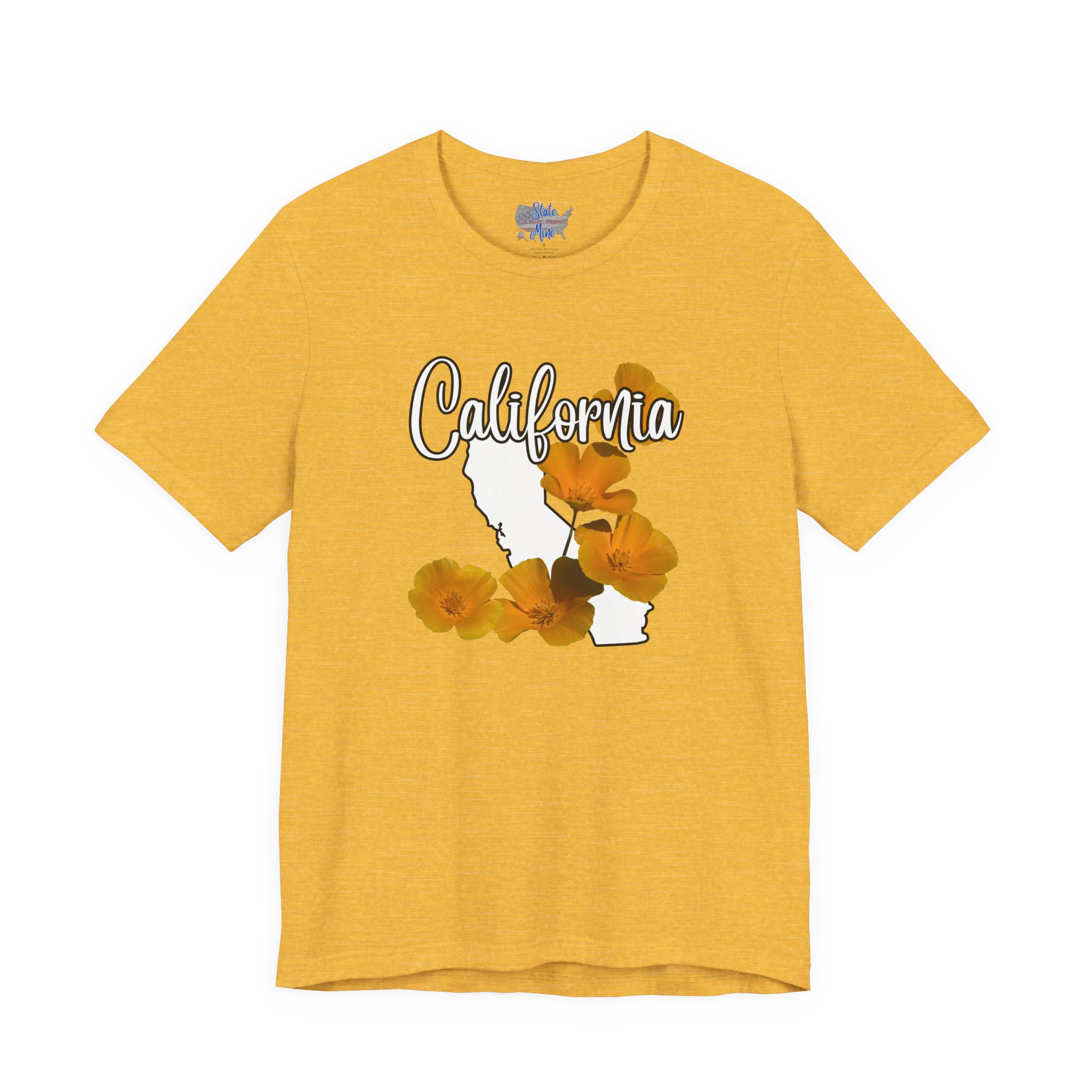 This California State Flower T-shirt featuring the California Poppy design exudes a casual and relaxed vibe, perfect for nature lovers and enthusiasts of the Golden State. It is ideal for everyday wear, outdoor activities, and as a souvenir of California. The unisex design makes it suitable for a wide range of buyers.