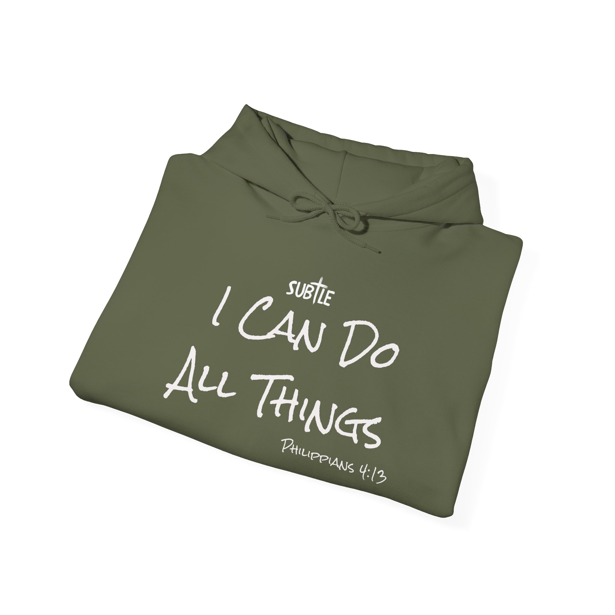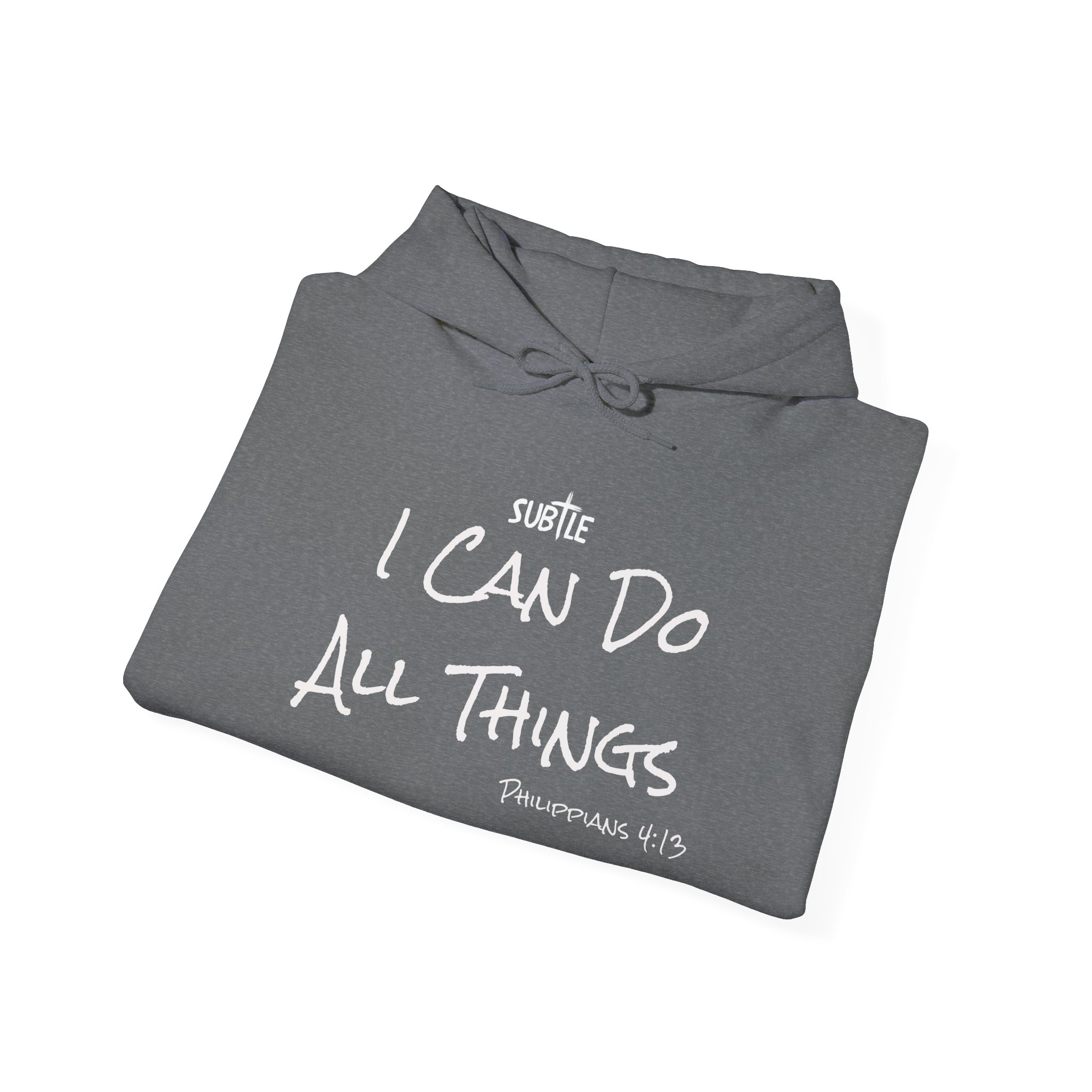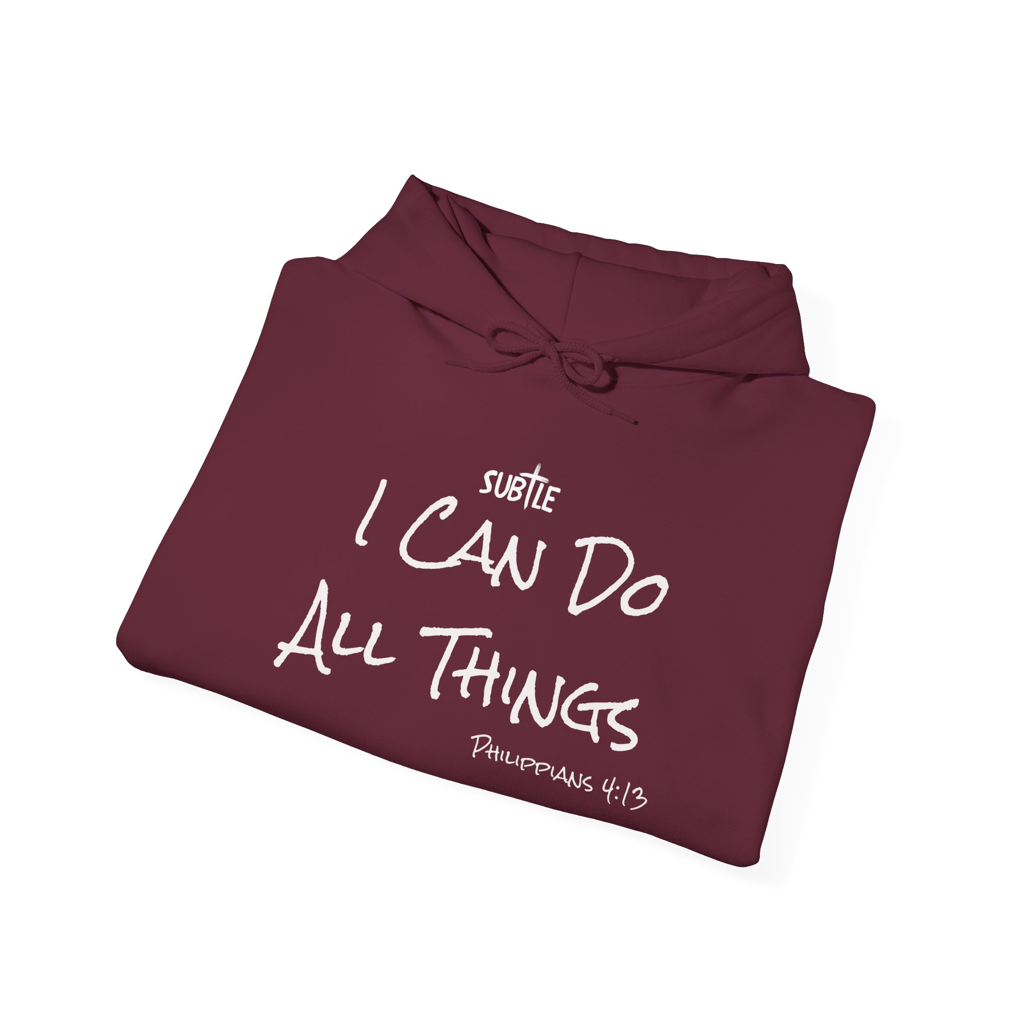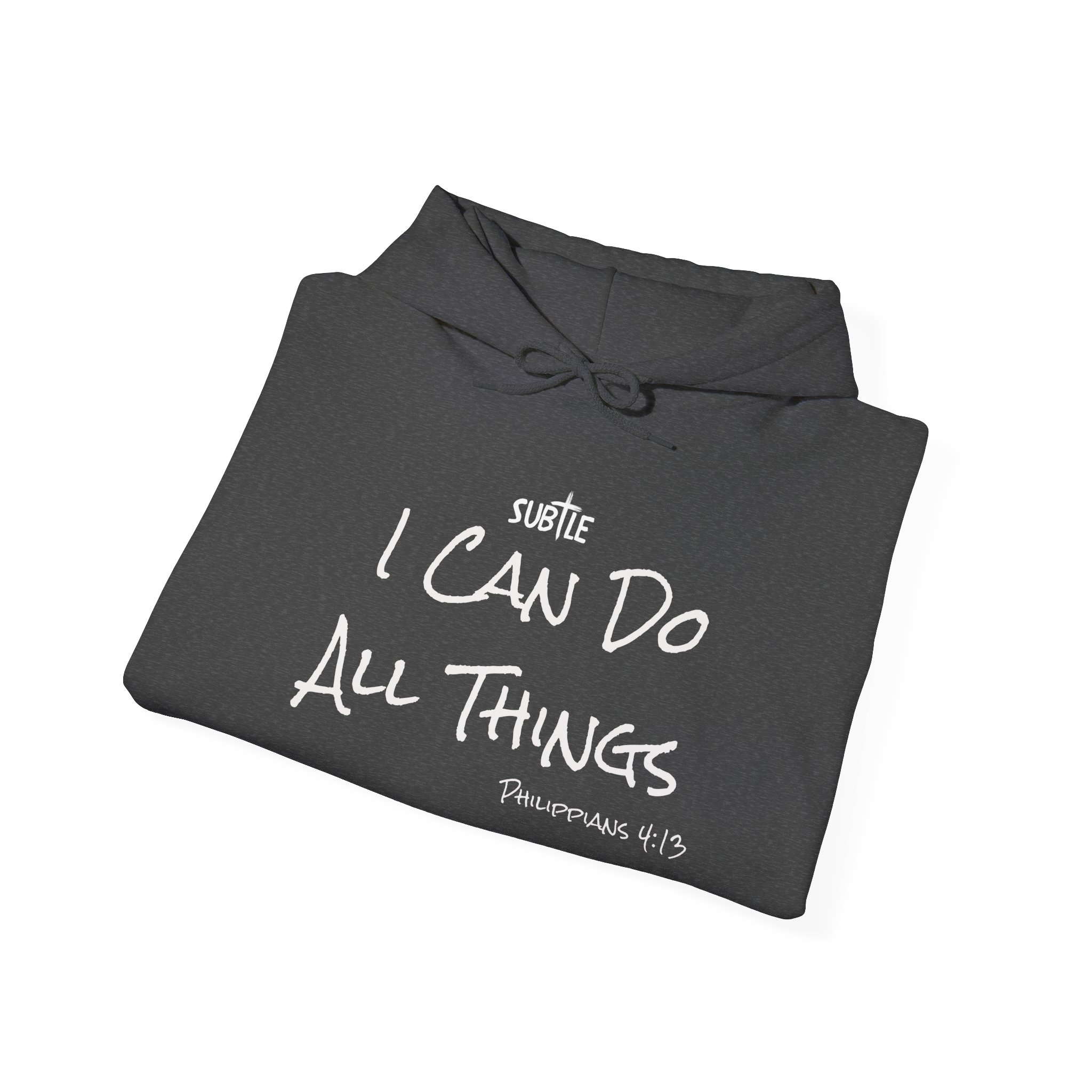 I Can Do All Things by Subtle–Unisex Dark Colored Hoodie, Cozy Sweatshirt, Faith-Based Inspirational Apparel, Philippians 4:13