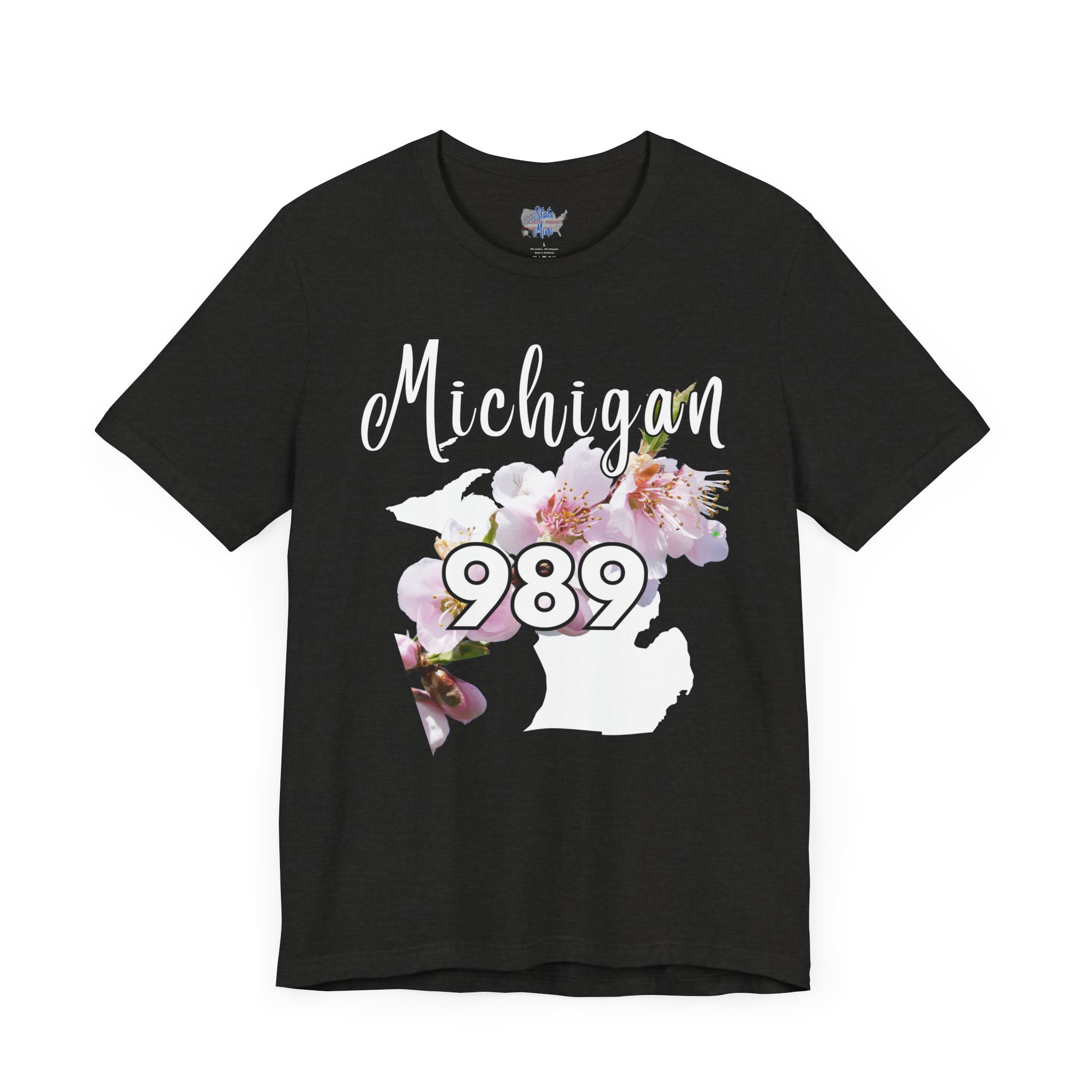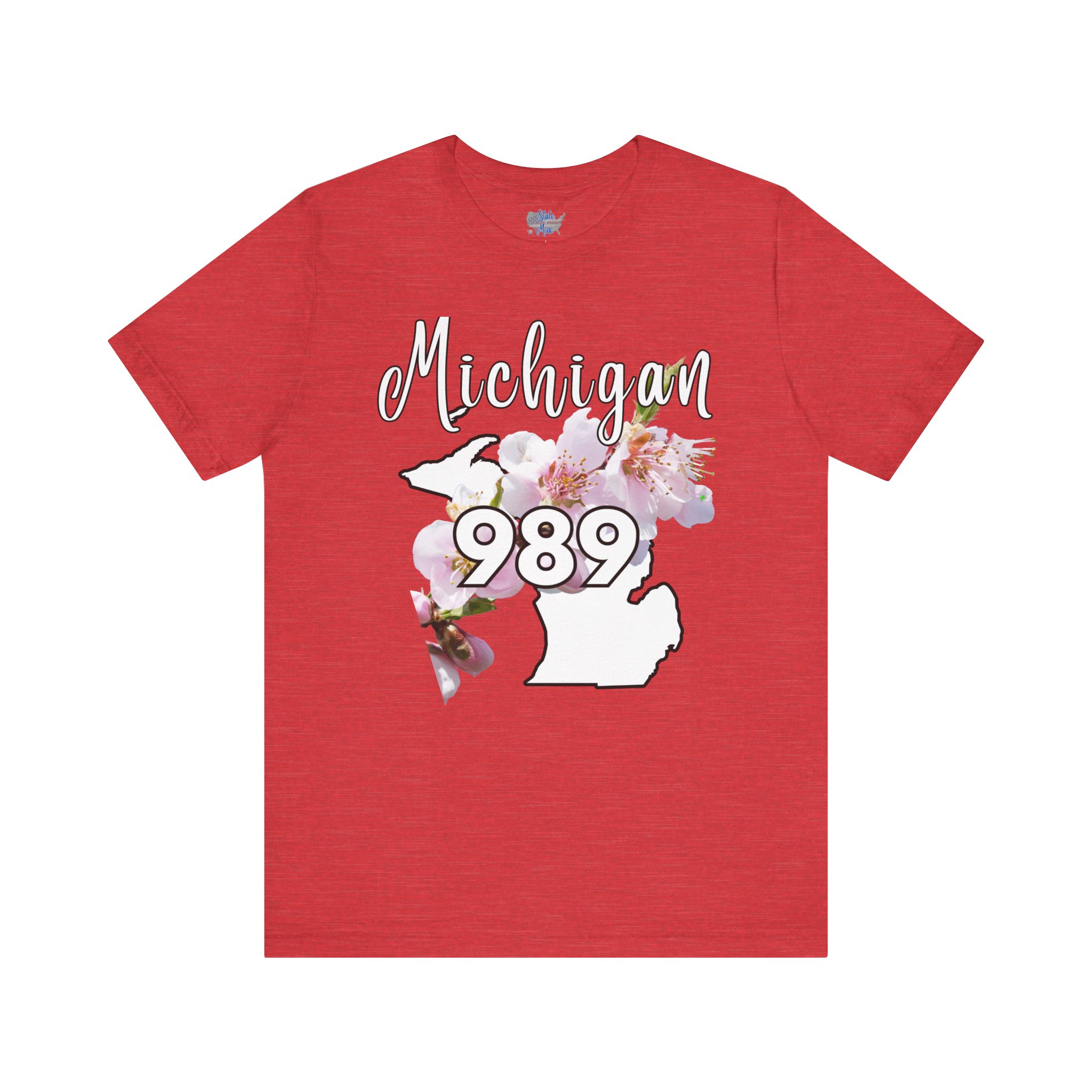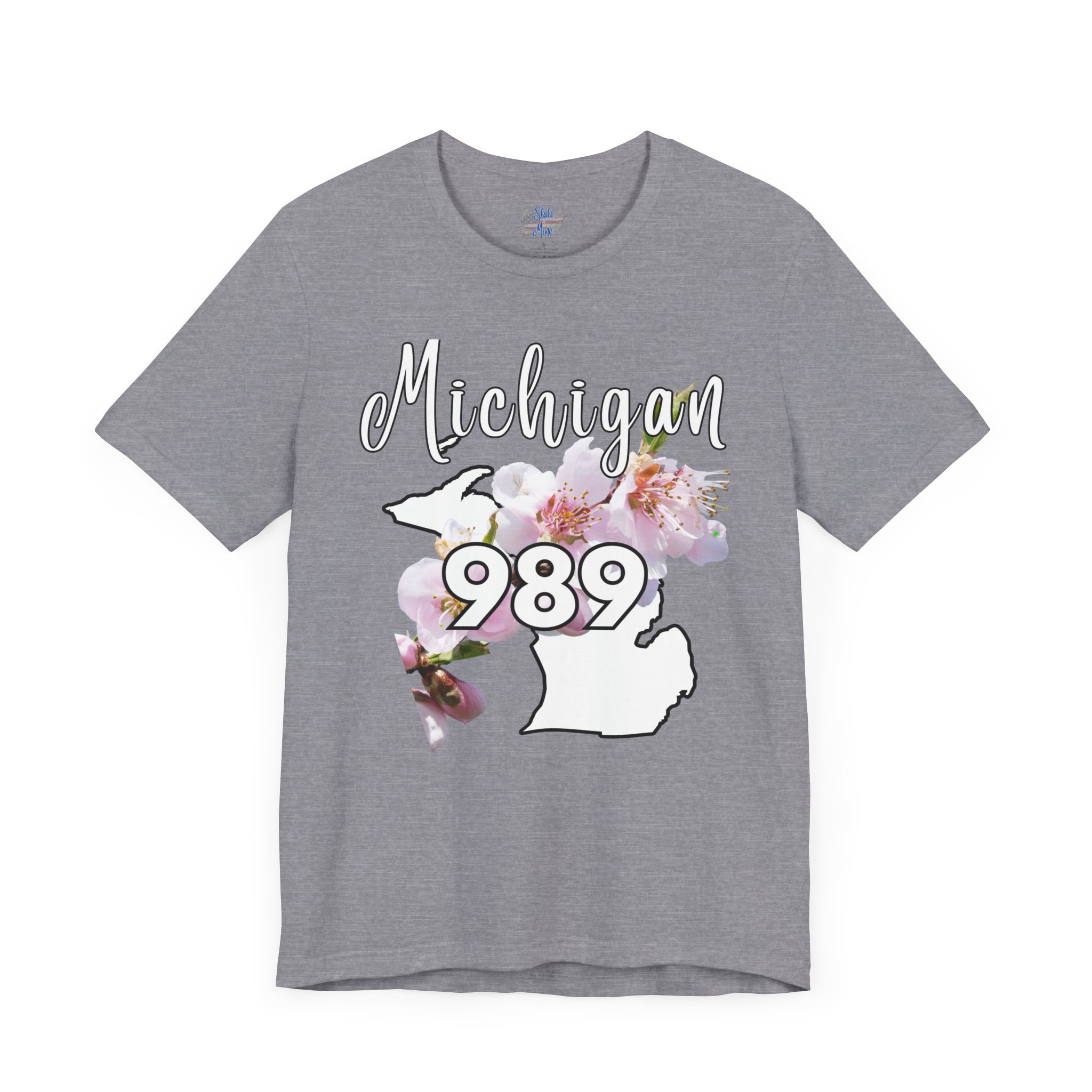 Michigan State Flower The Apple Blossom 989 Area Code by State of Mine. Unisex Jersey Short Sleeve Tee – Cozy Everyday Wear, Casual Style, Summer Essentials, Gift for Friends, Graphic Tee