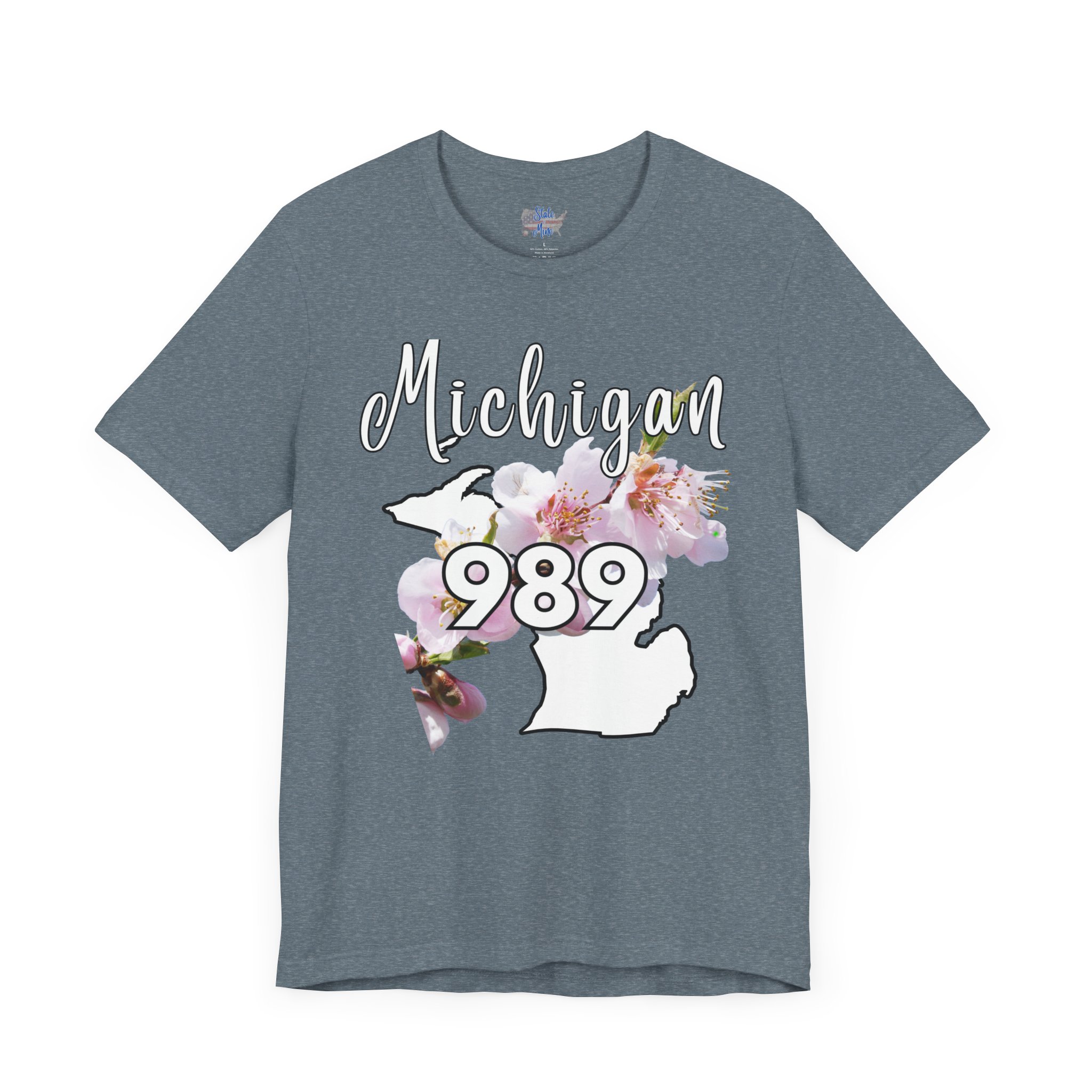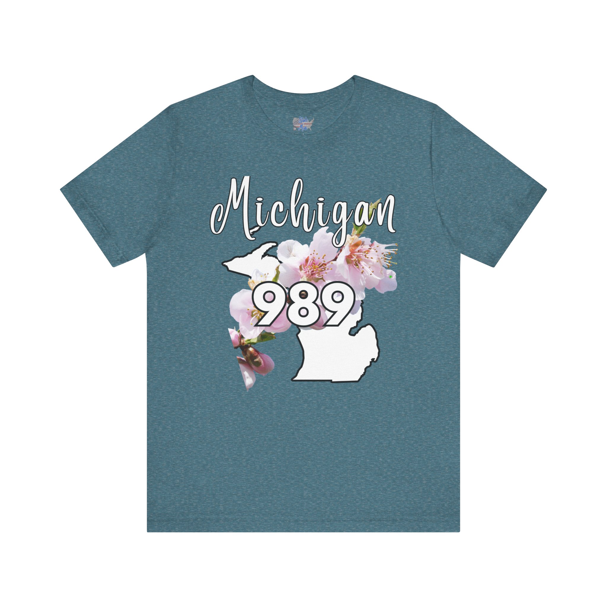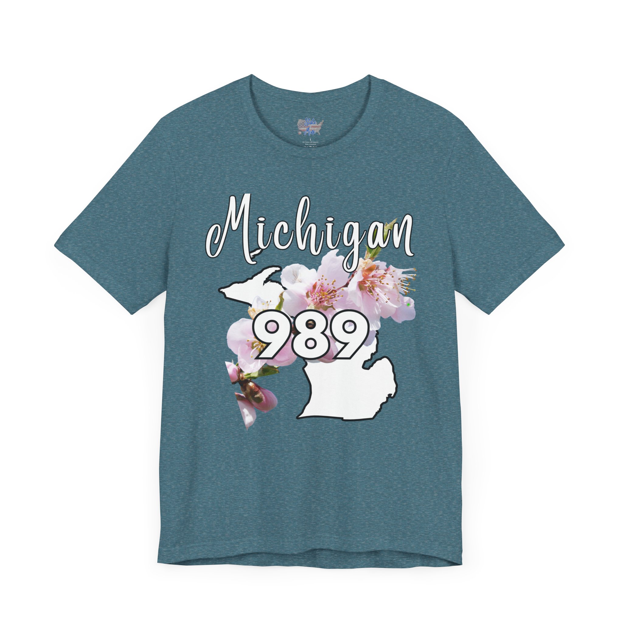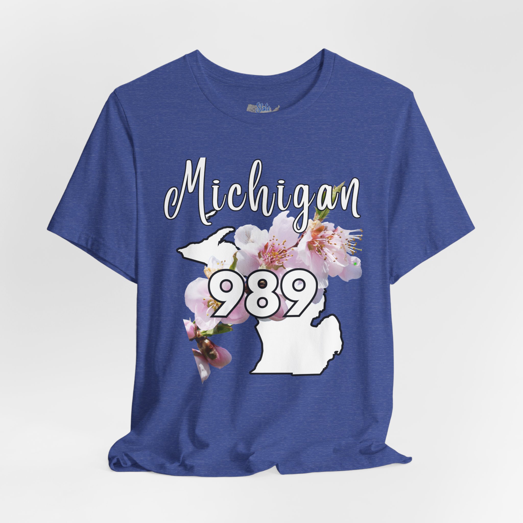 Michigan State Flower The Apple Blossom 989 Area Code by State of Mine. Unisex Jersey Short Sleeve Tee – Cozy Everyday Wear, Casual Style, Summer Essentials, Gift for Friends, Graphic Tee